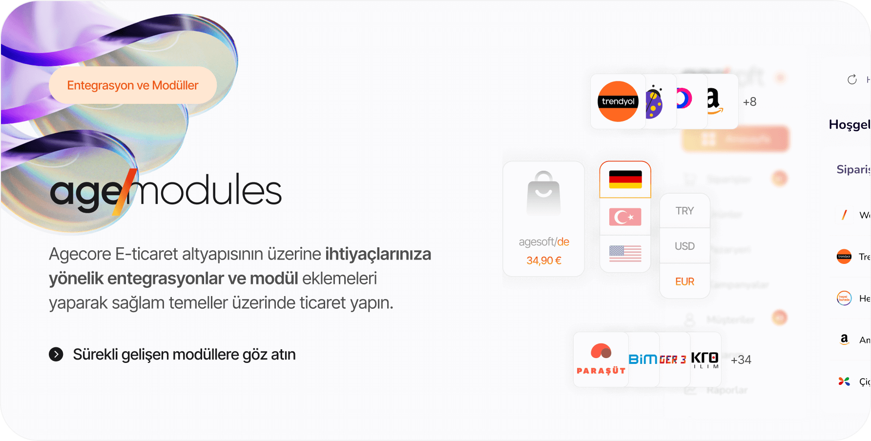 E-ticarette başarı, yalnızca ürünleri sergilemekle değil, tüm iş süreçlerini birbirine bağlamakla mümkündür. Agemodules tam da bu noktada devreye girer. Farklı entegrasyonlar ve modüller aracılığıyla işletmelerin özel ihtiyaçlarını karşılar.